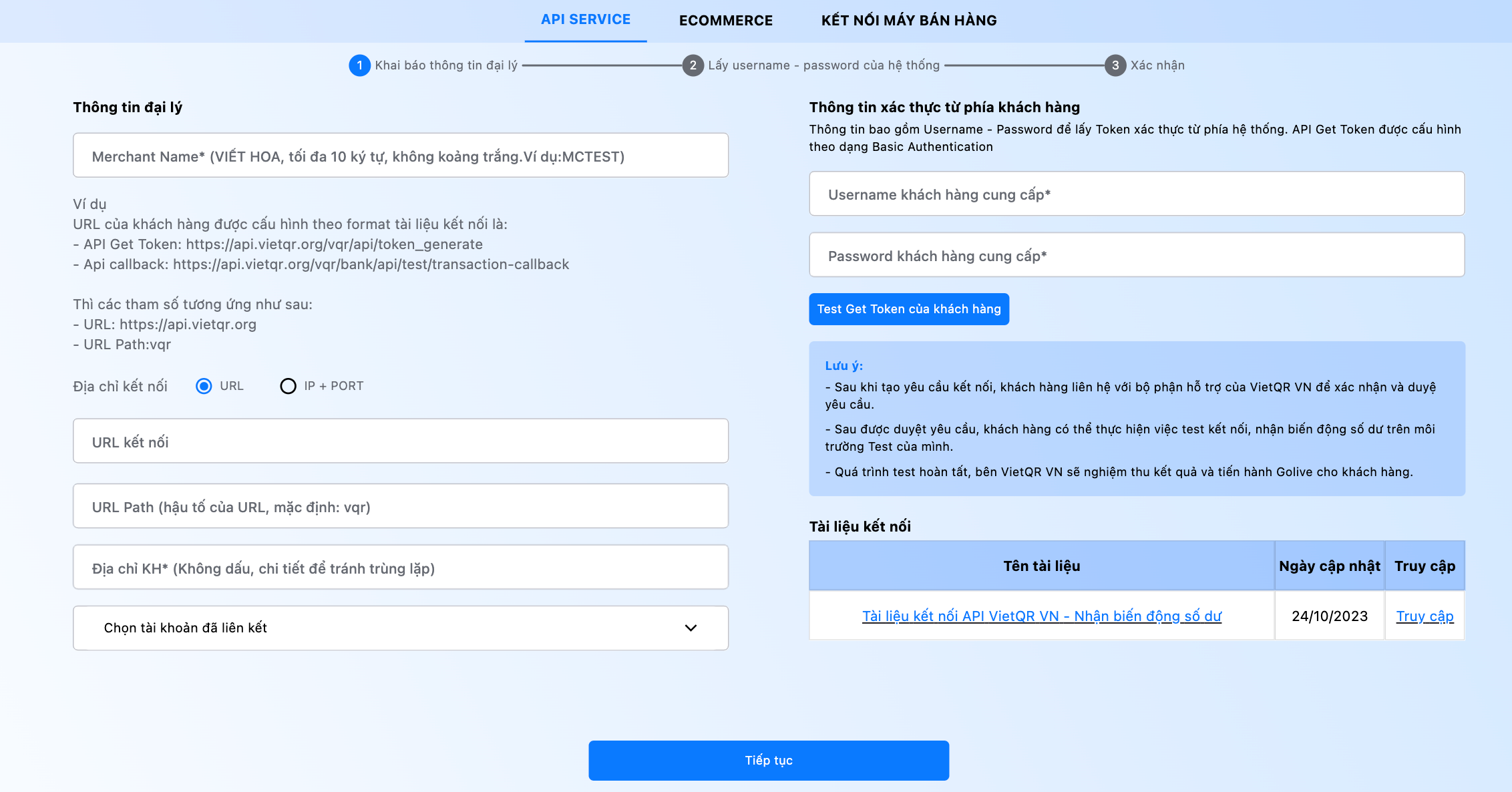 Đăng nhập đường link để khai báo kết nối tại đây : https://vietqr.vn/merchant/request