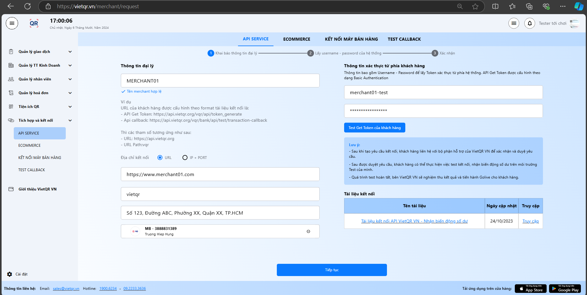 Sau khi điền đầy đủ thông tin, vui lòng gửi lại để chúng tôi có thể tiến hành tạo môi trường test và kiểm tra kết nối.